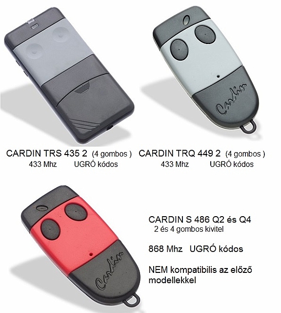 CARDIN TRS 435 és TRQ 449 távirányító adók 433.92 Mhz ugrókód. A piros CARDIN S 486 távirányító adó 868 Mhz-es. ugrókód. Nincs készleten.